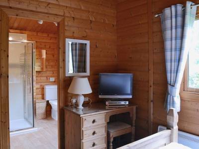 Scandanavian, cabin number 10, has an open-plan lounge with pull-down wall double bed, dining & kitchen area with patio doors leading onto the verandah, bathroom with toilet, 2 bedrooms - 1 double with en-suite shower, basin and toilet, 1 twin. Scandinavian Lodge is a dog friendly lodge.
